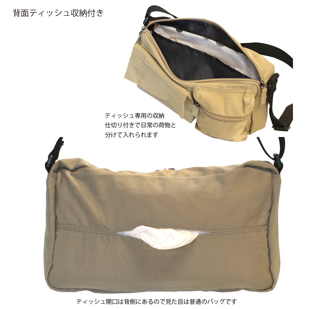 お散歩はもちろん花粉症の方にもオススメのソフトパックテッシュ+トラッシュポケット(ゴミ入れポケット)付きのショルダーバッグです。