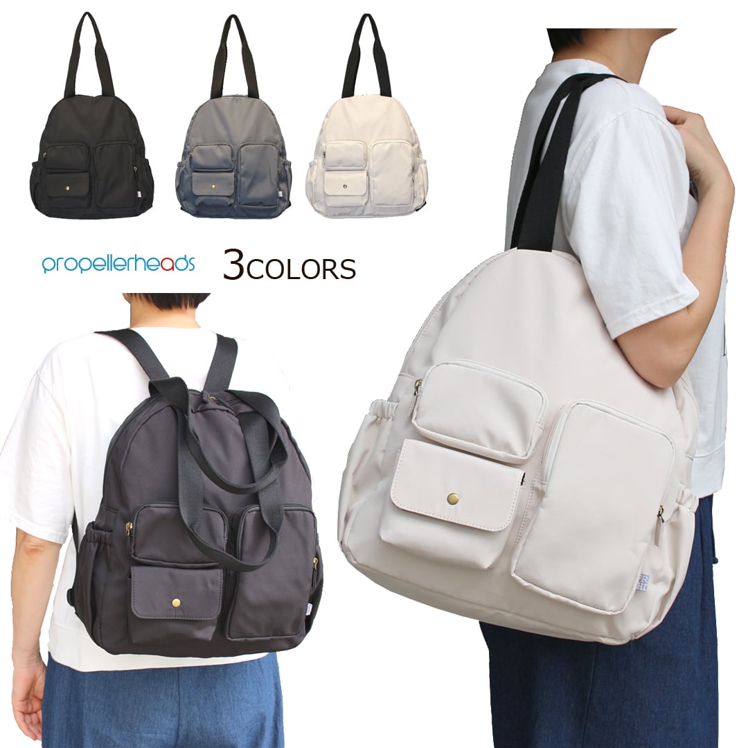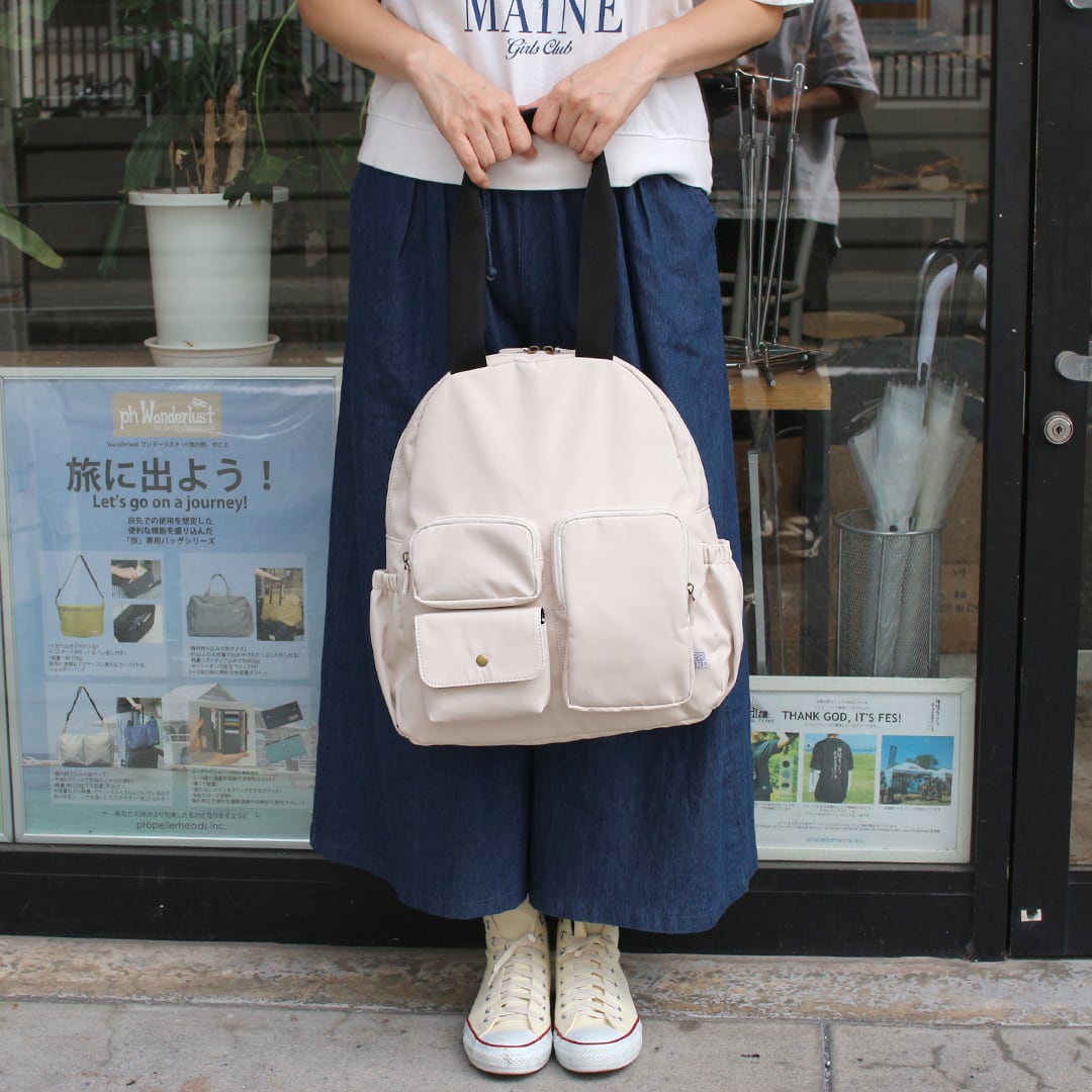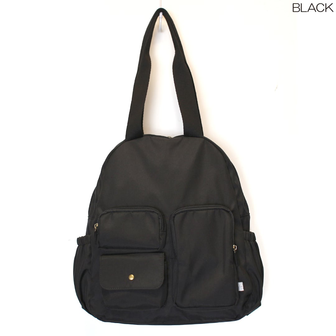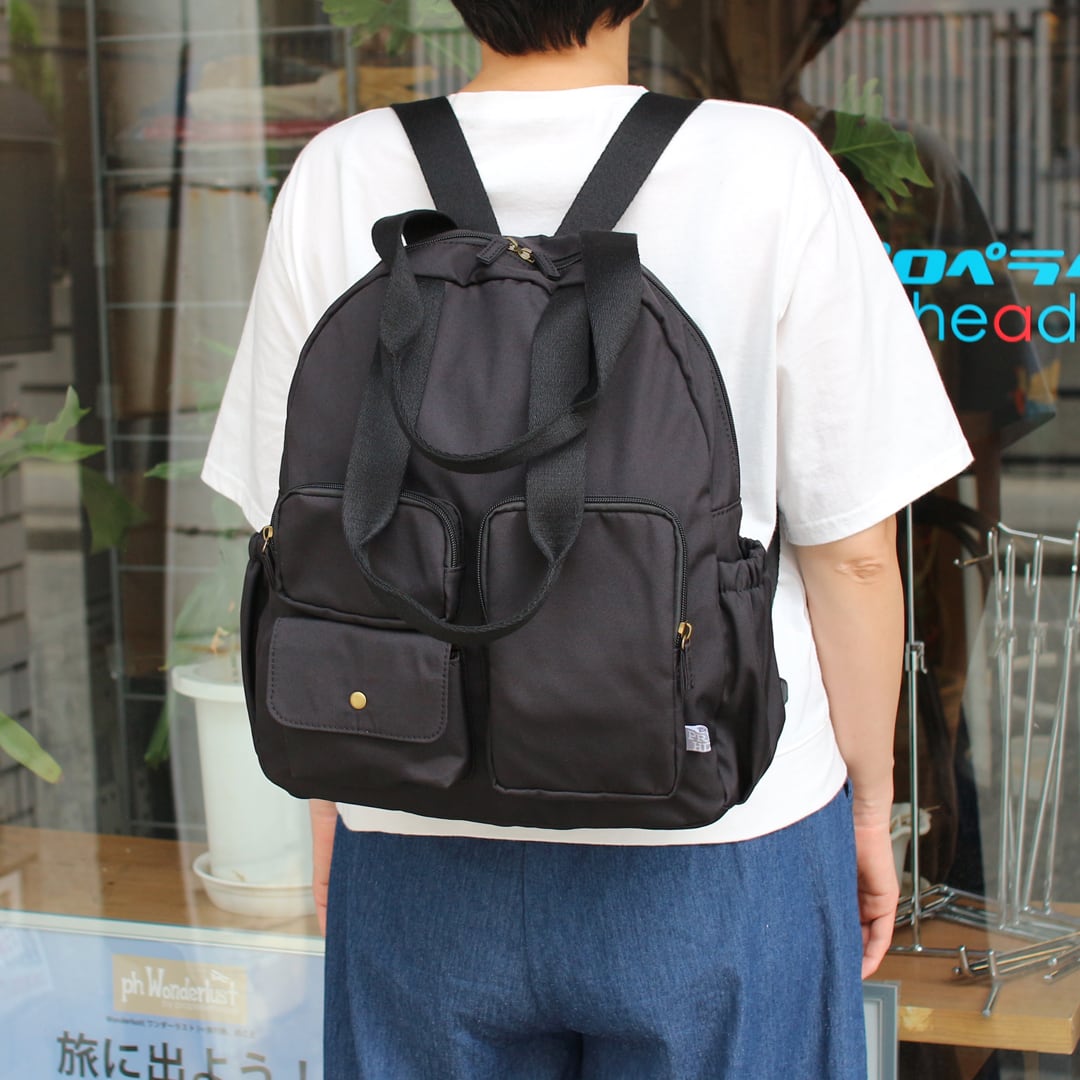 マットで優しい風合いの高密度ポリエステルを使用したリュックとしても使える多ポケットボストンです。