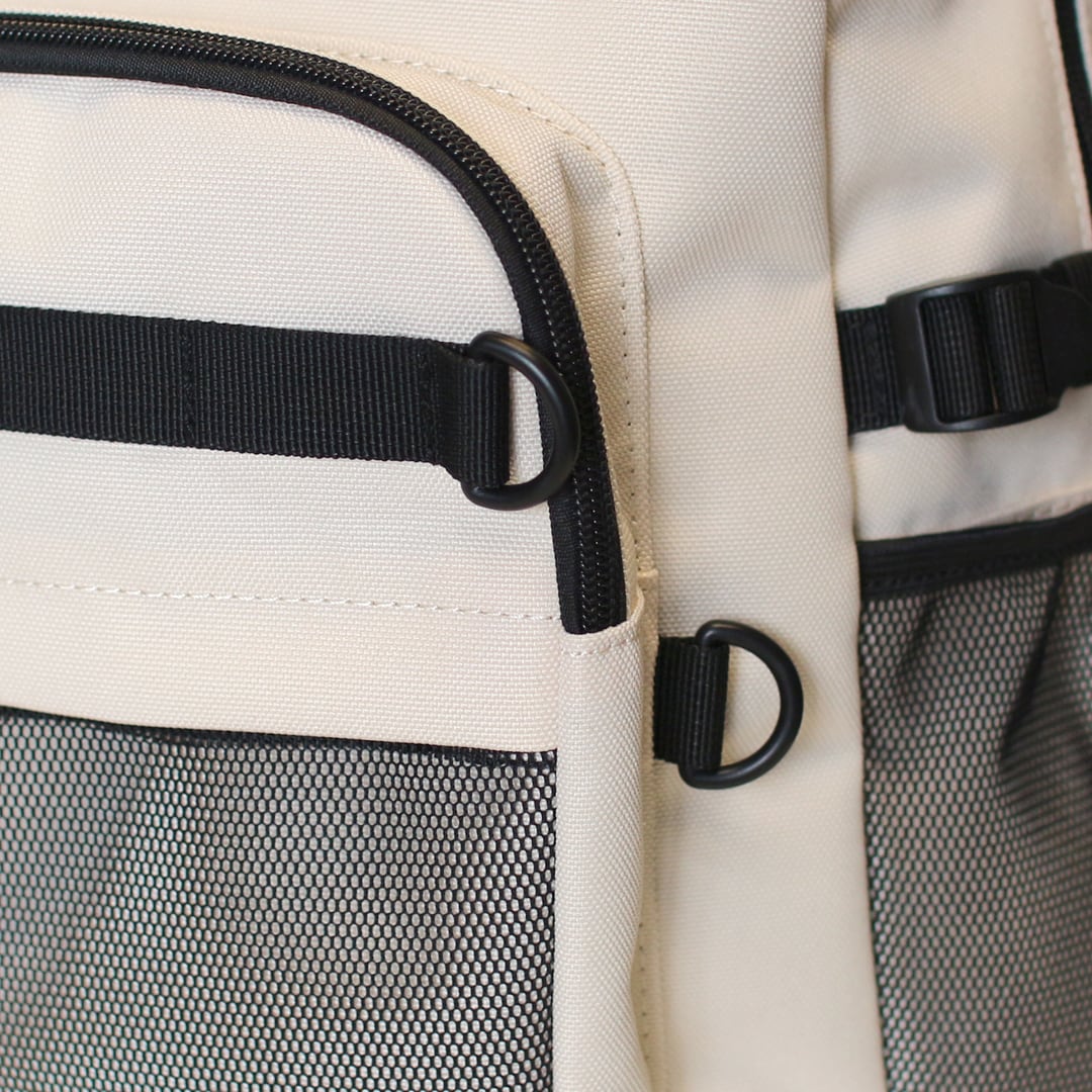 フロント部分には4か所のDカンとキーホルダーなどを通せるPPテープ付きでメッシュポケットもディスプレイに!