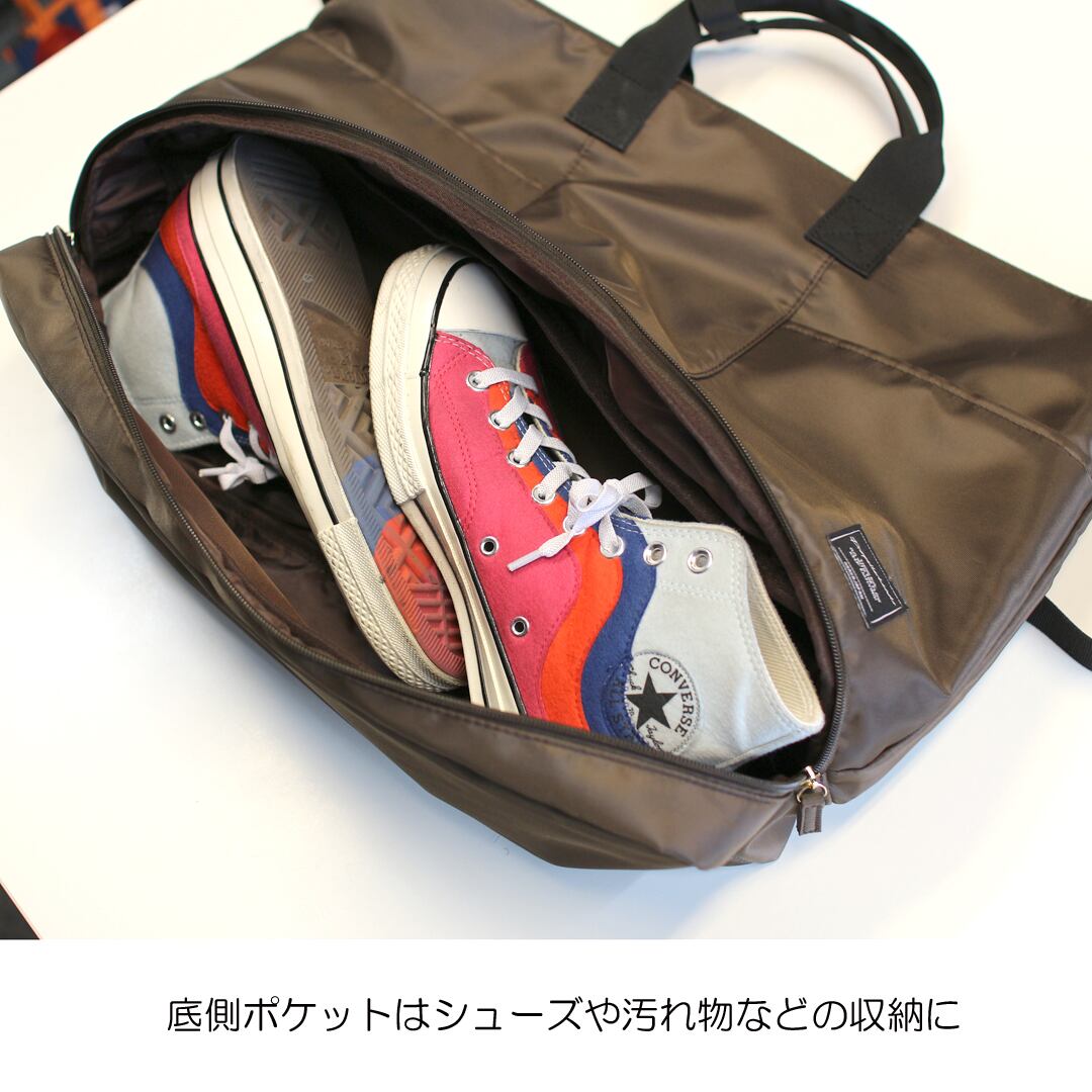 シューズや汚れ物などの収納に便利な底ポケット付きです。