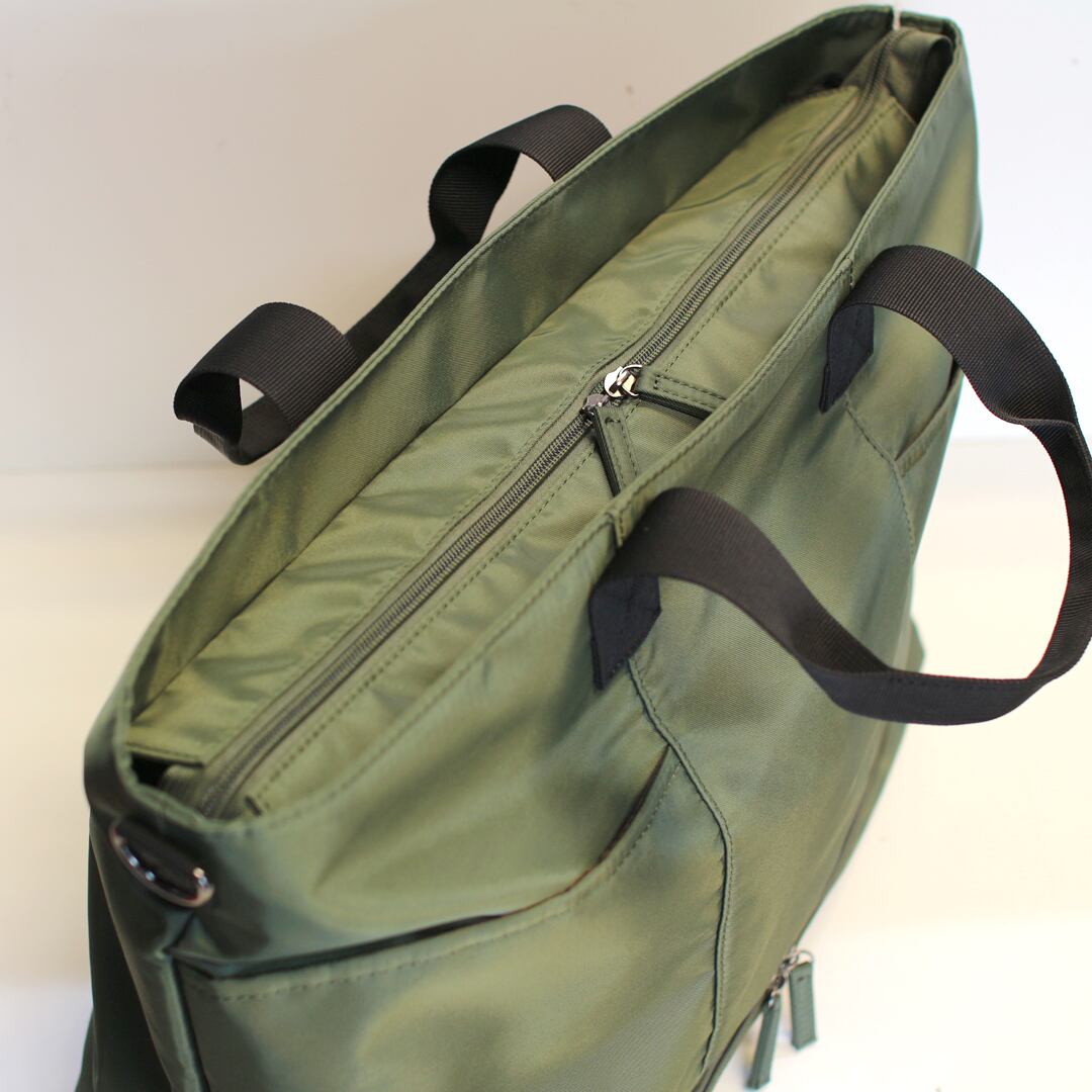 前面にはオープンポケット、背面にはキャリーオン可能なファスナーポケット付きです。