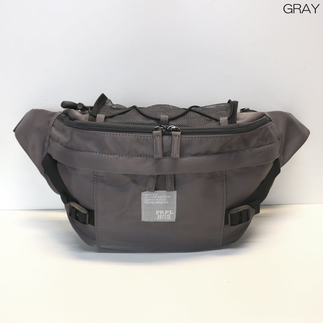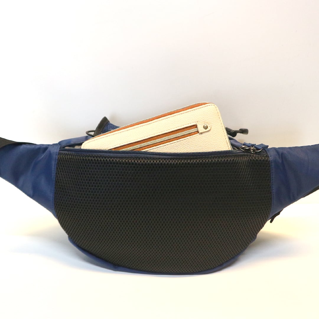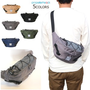 高密度ポリエステルを使用した外側上部にペットボトルを収納できる機能的な横型ボディバッグです。